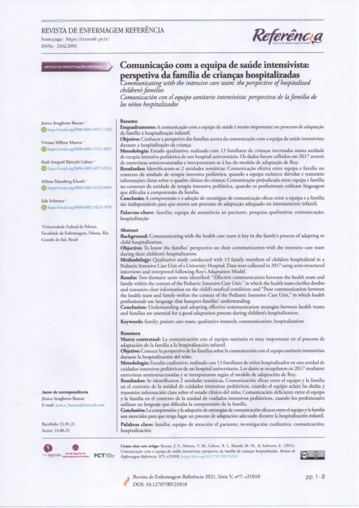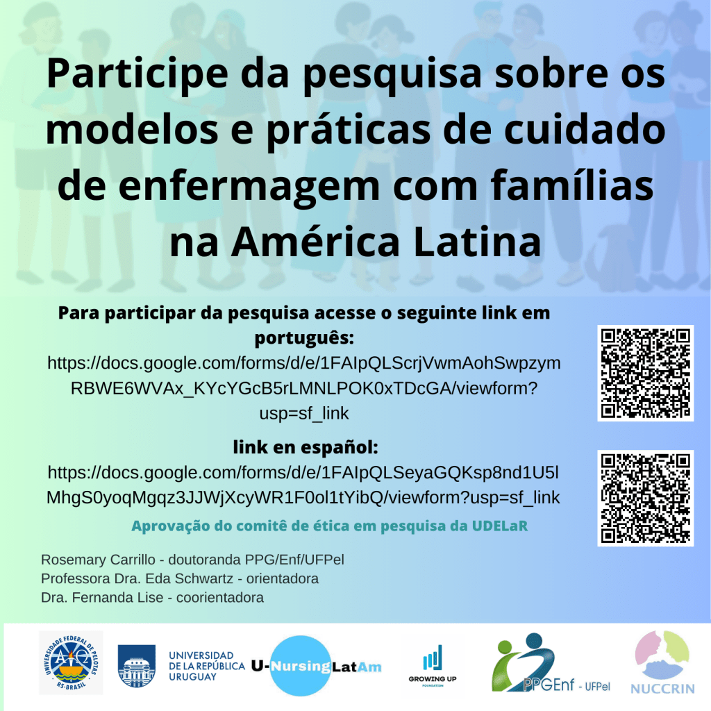 Participe da pesquisa sobre modelos e práticas de cuidado de enfermagem com famílias na América Latina, na atenção primária à saúde. Esse estudo é parte do meu projeto de  doutorado, sob a orientação da Profa. Dra. Eda Schwartz e coorientação da Dra. Fernanda Lise. Essa investigação tem como objetivo analisar os modelos e práticas de cuidado de enfermagem às famílias na América Latina, na atenção primária à saúde.