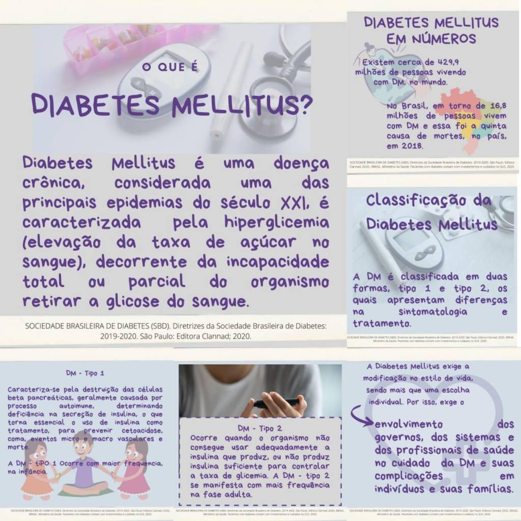 A Diabetes Mellitus é um distúrbio metabólico caracterizado por hiperglicemia, decorrente de deficiência na produção de insulina ou na sua ação, ou em ambos. A Diabetes é considerada uma doença crônica, cujo controle da sua evolução inclui o desenvolvimento de atividades de educação ao paciente e sua família para prevenir as complicações. De acordo com a Sociedade Brasileira de Diabetes (2020), uma pessoa com diabetes mal controlada, desenvolve mais complicações do que as bem controladas.1 Algumas complicações da Diabetes estão relacionadas à condições agudas (hipoglicemia, cetoacidose e síndrome hiperosmolar hiperglicêmica não cetótica), e as complicações crônicas, microvasculares (retinopatia, nefropatia, neuropatia) e macrovasculares (doença arterial coronariana, arterial periférica e cerebrovascular).1 Desdobramento da DM em longo prazo incluem dois grandes grupos: arteriopatia e neuropatia responsável por doenças cardiovasculares e a microangiopatia, desencadeadora da retinopatia e da nefropatia. A neuropatia periférica é destacada como maior fator de risco para amputações, em estágio avançado leva a perda de sensibilidade protetora, está presente em mais de 50% de pessoas com DM e acima de 60 anos.2 As úlceras nos pés – mais conhecidas como pé diabético – e as amputações de extremidades são as de maior impacto socioeconômico e que afetam a qualidade de vida do paciente com diabetes.3 As atividades de educação para o controle da diabetes incluem informações sobre alimentação saudável, contagem de carboidratos, prática de exercícios físicos, identificação e tratamento da hipoglicemia, administração de insulina, insulinoterapia intensiva e o rastreamento de complicações. Os objetivos de controle glicêmico devem ser determinados individualmente, de acordo com a idade do paciente e a capacidade de identificar e tratar hipoglicemias.1 Estudo mostrou que a intervenção em atividade educativa em grupo e o telemonitoramento, com ligações telefônicas para discutir assuntos como o uso de medicamentos (orais, insulinas, manejo, armazenamento e técnica de aplicação), e a prática alimentar saudável, permitiram estimular e potencializar os cuidados de saúde das pessoas que vivem com a DM, de forma a atender as necessidades dessas pessoas, bem como, um viver melhor.4 Portanto, para o alcance do objetivo de controle glicêmico da DM, considera-se fundamental o envolvimento da família, pois atitudes pouco colaborativas não permitem o autocuidado acontecer, sendo a família é um fator influente na adoção de medidas de autocuidado.5 A partir do exposto, destaca-se a importância da Enfermagem envolver a família no controle glicêmico da pessoa com DM, a fim de diminuir as complicações agudas e crônicas ocasionadas pela Diabetes Mellitus.